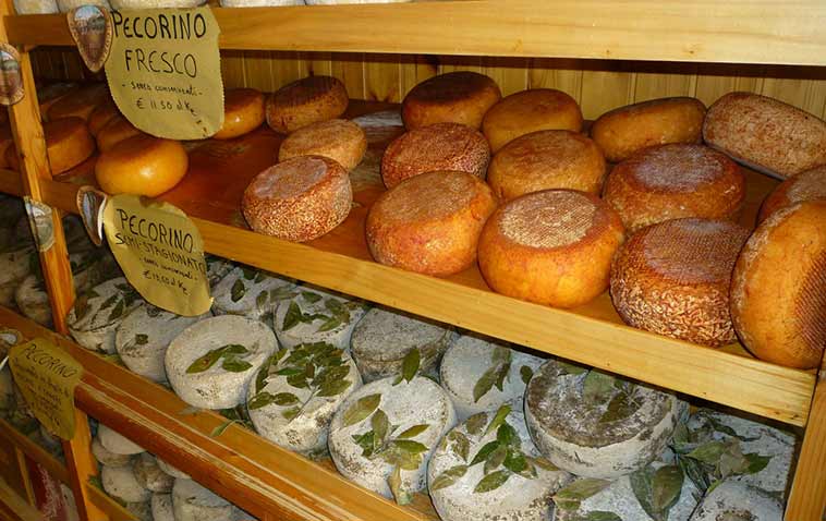 You will often find cheeses in antipasti (appetizers) along with prosciutto and other cured meats. The most typical cheese of the region is Pecorino toscano, made from sheep’s milk, which comes in different styles depending on how long it has been aged. When it is more mature it is referred to as stagionato (“seasoned” or “aged”); it is harder, sometimes crumbly and has a decisive buttery and nutty flavour. The other two types, “semi-stagionato” and “fresco,” have a softer texture and milder cream and milk tastes. A good Pecorino Stagionato may be encountered as an appetizer or at the finish of a meal, served with pears and walnuts or drizzled with strong chestnut honey. Other local cheeses are marzolino, a small pecorino made only in springtime when the ewes eat the new grass, and caciotta which is all or partly cow's milk.