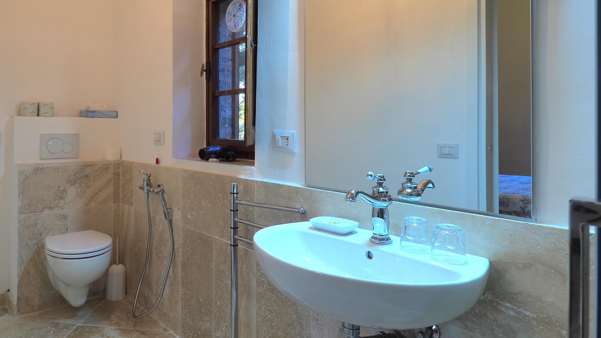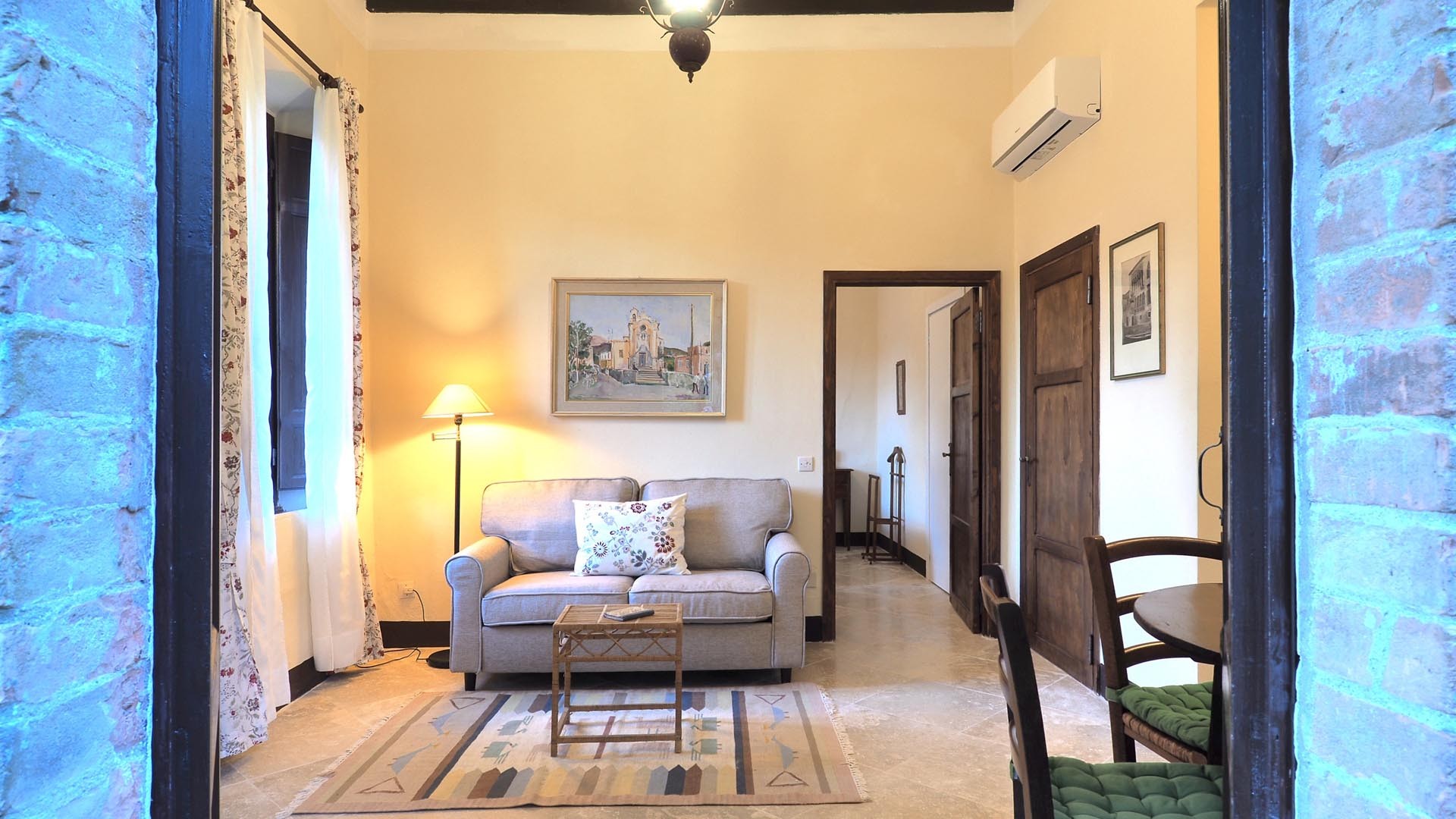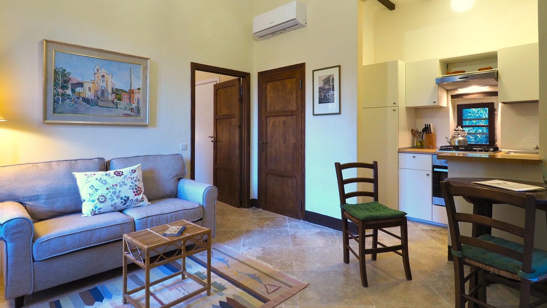 The living room has a travertino floor and the kitchen is fully equipped, with full size stove and refrigerator. Air conditioning (available for an extra fee) can also be used to heat in midseasons.