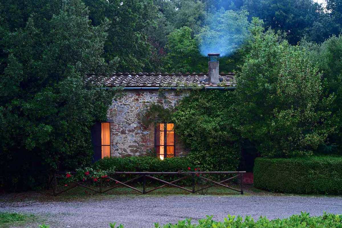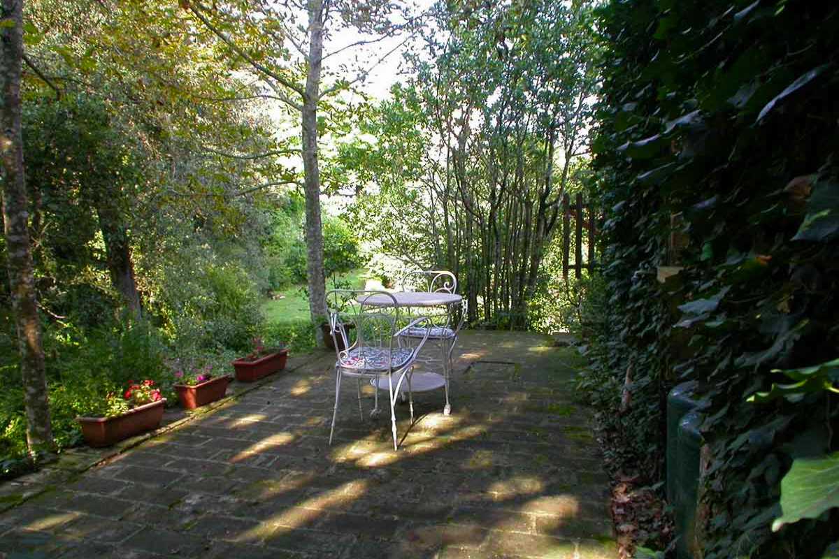 At the rear of La Scuola is a secluded terrace with table and chairs for two, nestled in the trees, that provides a quiet area for dining or relaxing and direct access to the woods.