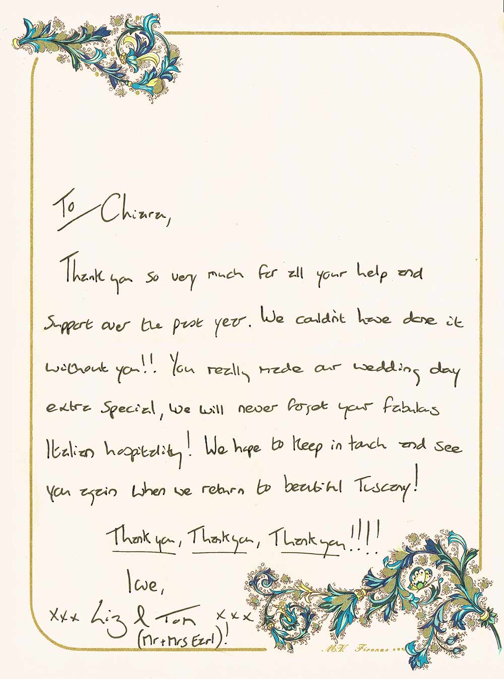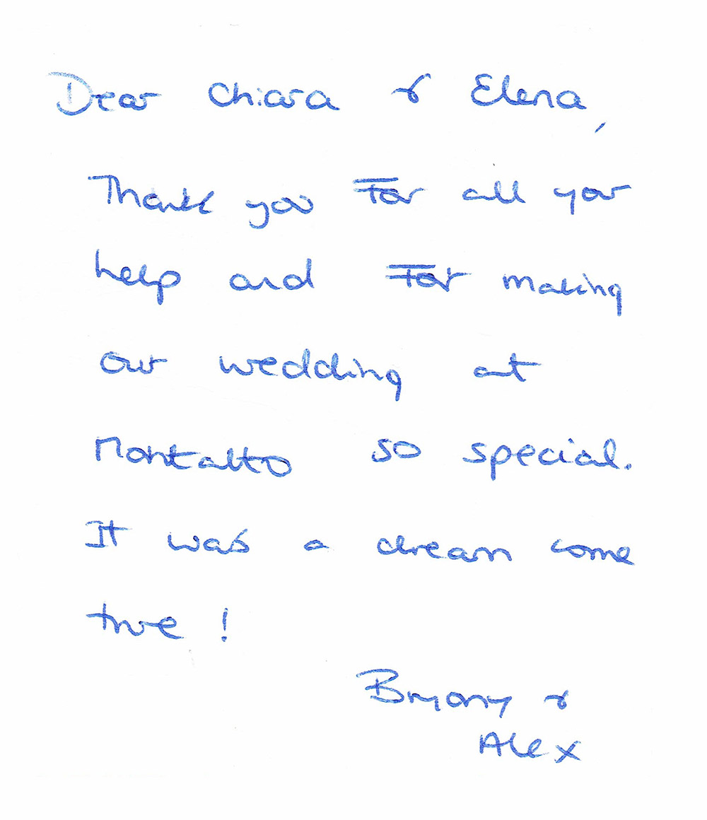 Chiara - from the second we made an enquiry you were AMAZING. Living in New Zealand and organising a wedding overseas was quite an undertaking but you just made it so easy and straightforward. Your organisation, efficiency and hospitality to us and our guests was outstanding - grazie grazie grazie! We really can't thank you enough!!